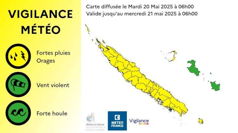 - A.T. | Crée le 20.05.2025 à 09h17 | Mis à jour le 20.05.2025 à 09h17ImprimerSource Météo France NCMétéo France NC émet une vigilance jaune aux fortes pluies et aux orages, ce mardi 20 mai, dans le pays. Seules Lifou et Maré devraient être épargnées.