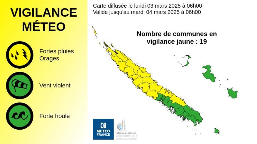 Météo France NC place, ce lundi 3 mars, 19 communes de la Grande Terre en vigilance jaune aux fortes pluies et aux orages. La zone concernée s’étend de Bourail à Bélep pour la façade Ouest et de Thio à Poum pour la façade Est.