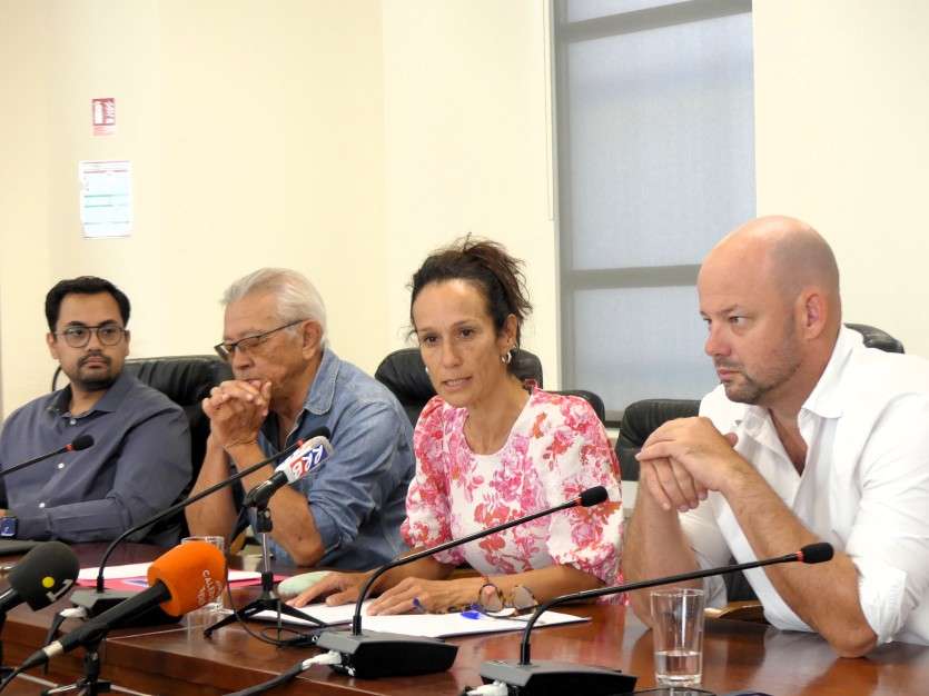 - Baptiste Gouret | Crée le 20.05.2024 à 19h24 | Mis à jour le 20.05.2024 à 19h30ImprimerDe gauche à droite, Jérémie Katidjo-Monnier, Yannick Slamet, Isabelle Champmoreau et Christopher Gygès ont animé une conférence de presse sur la situation sanitaire, alimentaire et économique du territoire en ce septième jour d’émeutes. Photo Baptiste GouretAu septième jour d’émeutes, les membres du gouvernement Isabelle Champmoreau, Jérémie Katidjo-Monnier, Yannick Slamet et Christopher Gygès ont fait le point sur la situation sanitaire et alimentaire du territoire, ainsi que sur le nécessaire bilan économique à établir.