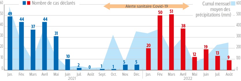 - Avec 212 cas recensés depuis le début de l'année, la Dass-NC alerte à nouveau sur les taux élevés de contamination de la population à la leptospirose. Les personnes infectées sont principalement des hommes (76 %), et se trouvent pour la plupart en province Nord (66 %).« D'habitude on a entre 50 et 150 cas par an. Depuis 2021, en raison du phénomène météo La Niña, on atteint des records, avec plus de 200 cas. C'est alarmant », déclare Anne Pfannstiel, médecin de prévention à la Direction des affaires sanitaires et sociales de Nouvelle-Calédonie (DassIl vous reste 92% de l'article à découvrir.Cet article est réservé aux abonnés.