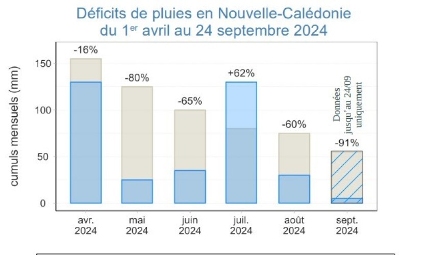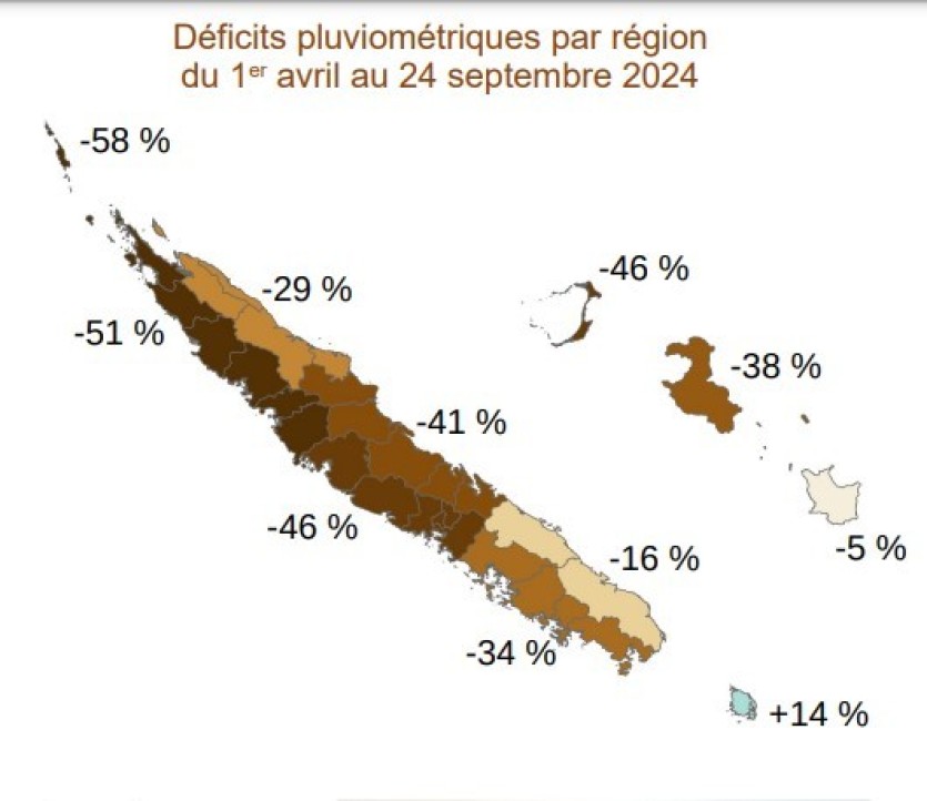 Source Météo France NCSi ces déficits concernent l’ensemble du pays (en dehors de l’île des Pins), la côte nord-ouest est la plus touchée, avec une ampleur de sécheresse qui ne se produit en moyenne que tous les quinze ans à Koumac, Kaala-Gomen et Koné, et même tous les 40 ans à Poum.