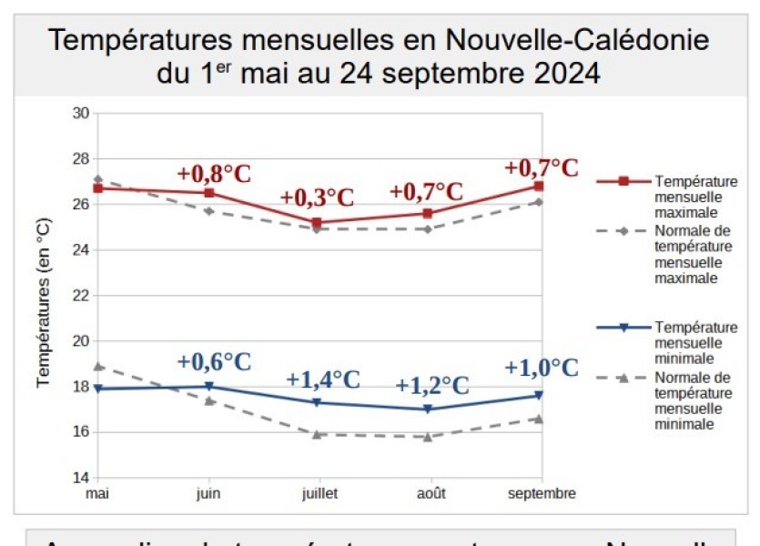 C’est un effet concret du réchauffement climatique dans le pays. Depuis juin, les températures ont été plus élevées (en moyenne de plus d’un degré) que la normale sur toute la Nouvelle-Calédonie. Cet écart est plus marqué pour les températures minimales, avec des nuits "particulièrement chaudes", que pour les maximales, en journée.