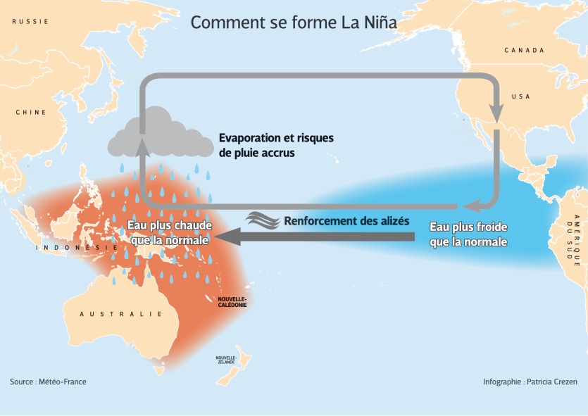 Or, lorsqu’un épisode La Niña se forme, ce mécanisme naturel s’accentue, ce qui se traduit par un renforcement de ces alizés le long de l’équateur vers notre région, ce qui engendre des eaux encore plus chaudes, des températures plus élevées et donc des pluies encore plus abondantes dans l’ouest du Pacifique.