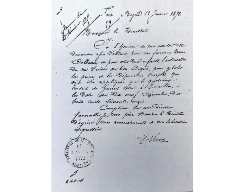 Avant son départ, il écrit une lettre au ministre de l’Intérieur : " J’ai l’honneur de vous adresser cette demande afin d’obtenir pour ma femme, Marie Dolbeau, et mes deux enfants l’autorisation de me suivre au lieu indiqué pour y subir la peine de déportation simple qui m’a été appliquée." Dolbeau va voyager sur l’Orne, le 5e convoi de déportés.