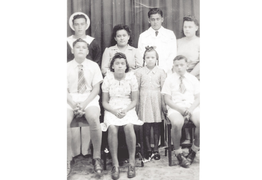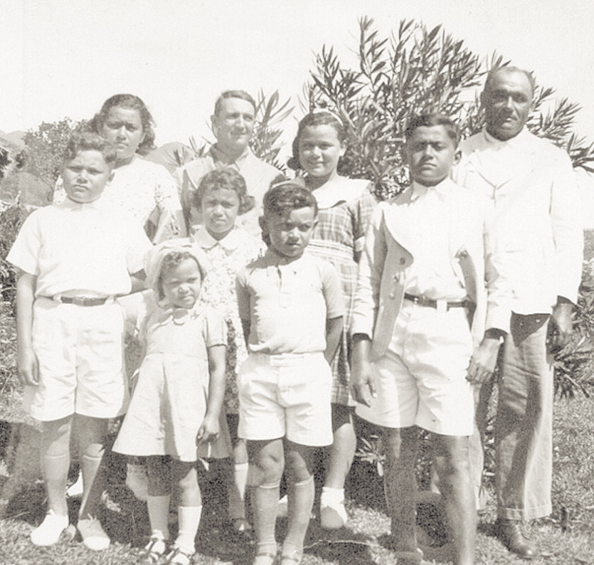 Alexandre Genet avec ses enfants lors de leur communion à Nakéty, Canala, le 18 octobre 1942. Au 3e rang, de gauche à droite : Irène, un ami de la famille, Josiane, Alexandre (père). Au 2e rang, de gauche à droite : Raoul, Suzanne, future Mme Cuni, Léna, future Mme Martin, et Alexandre (fils). Photo DRAlexandre, petit-fils de l’ancêtre et fils reconnu par Joseph, a une grande descendance, majoritairement installée en ville. Marié à Georgette Marin, une métisse mélanésienne et chinoise, Alexandre a sept enfants dont Raoul, aujourd’hui octogénaire. Raoul habite Nouméa et se souvient très bien de son enfance : " Mon père a été élevé en tribu. Jeune, il a travaillé chez Louis de Béchade à Naïa, il était stockman. Nous habitions à côté de la station, après N’Dé, le long de la côte. Puis nous sommes partis à Nakéty où mon père a travaillé à la mine pendant sept ou huit ans. À la fin de son contrat, nous sommes retournés à Nouméa, nous habitions une maison vers le Faubourg-Blanchot.