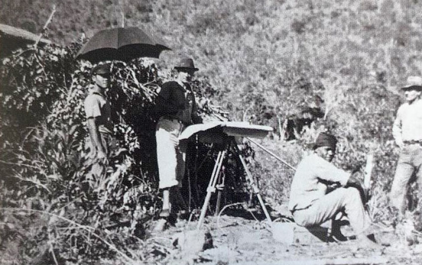 Le 6 septembre 1941, Pierre Goyetche (à droite) prospecte avec le géomètre Poulet. A 71 ans, il est depuis longtemps à la retraite. Photo DRMais l'époque est à la mine. Pierre s'associe à M. Prévost et obtient le droit d'une concession à Téné pour un rendement de 3 000 tonnes annuelles à 7%. À la même époque, il épouse Marie-Catherine Gastaldi, fille de forçat italien. Ils ont ensemble quatorze enfants.
