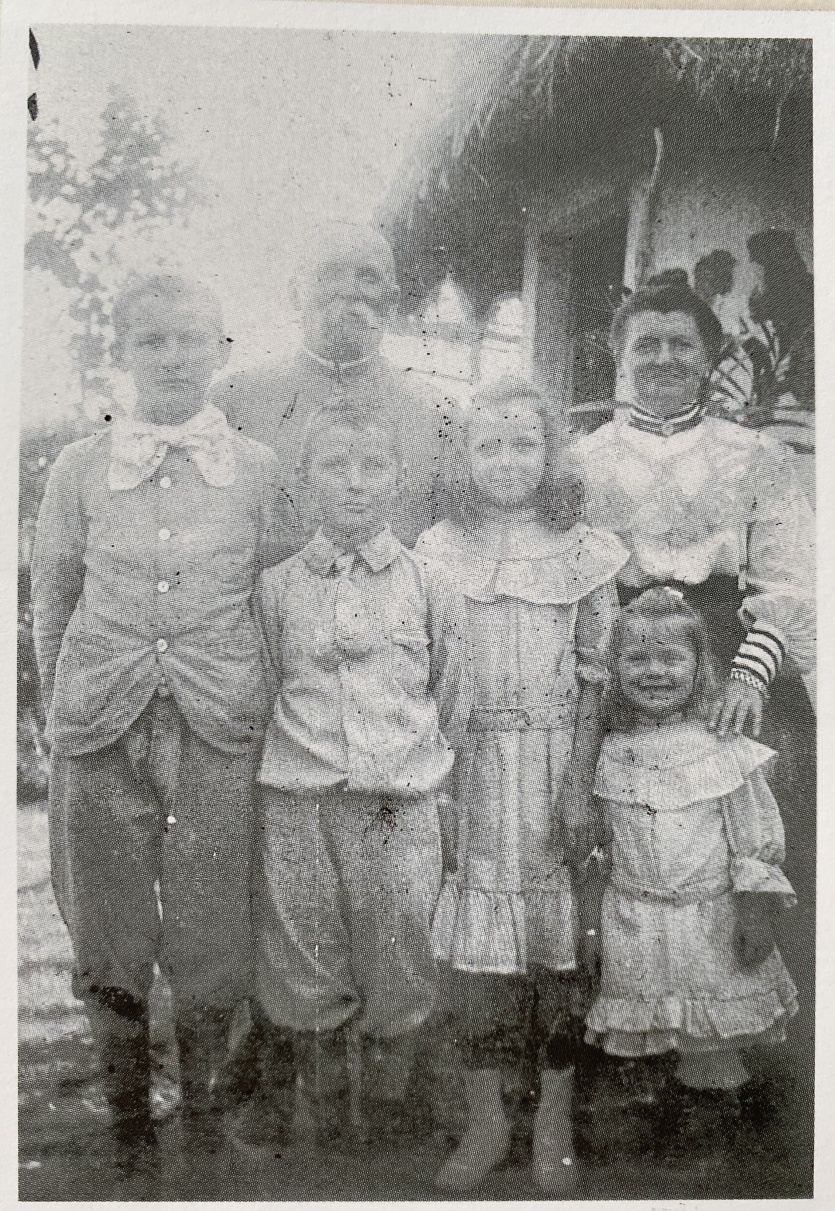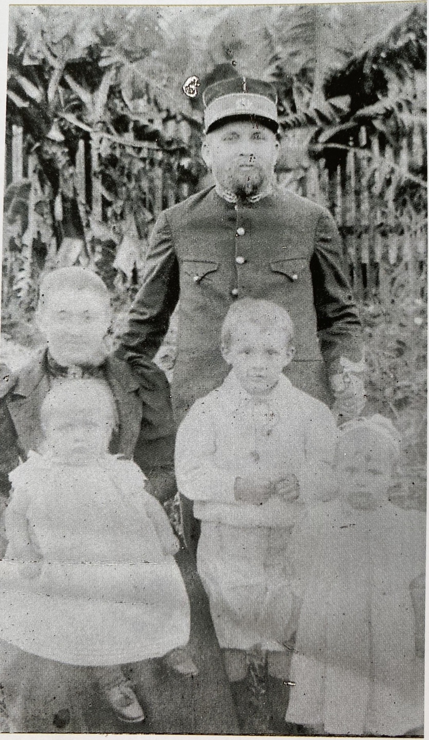 François et Marie avec, au premier plan, Henri, Maurice, Mauricette et Hectorette. Il manque Hector Marcel né en 1909.En 1900, la famille est à Thio, et là encore, Marie fait la classe puis mes grands-parents déménagent à Koné en 1901. L'année suivante, l'année de naissance d'Hectorette, un accident survient : alors qu'il est en service, François est blessé par un condamné.