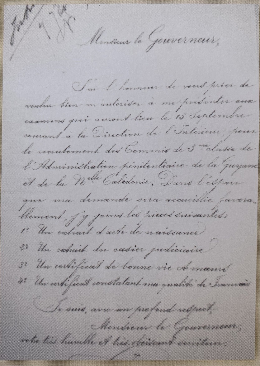 Lettre écrite et envoyée par Étienne Lucien en septembre 1885 afin de demander l'autorisation au Gouverneur de postuler au concours de commis de l'administration pénitentiaire. Étienne est nommé le 9 décembre 1889. La période entre 1885 et 1889 reste encore floue, la famille ignore ce qu'il fait.Dans la famille, on a toujours bien insisté sur le fait qu'il n'était pas surveillant. Il appartenait à la classe des commis et a eu plusieurs fonctions comme celle de secrétaire dont ma grand-mère était très fière.