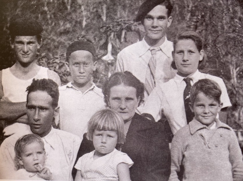 Henri, jumeau de René. Le grand-père de Monique et Jacqueline est entouré de sa famille en 1938. Premier rang : Henri portant Michel, Angéline portant Danièle, et Claude. Debout derrière : Didi, Yvan, André (le père de Monique et de Jacqueline) et Simone. Il manque Jeannot qui se trouve tout à gauche, hors cadre, il posait pourtant au côté de ses frères et sœurs !Henri et René, les jumeaux, ont participé à la construction du premier barrage de Yaté entre 1921 et 1925. Puis tous deux deviennent mécaniciens : Henri est spécialisé dans le réglage et l'affûtage des scies, d'abord à la société Le Kaori, puis, pendant la guerre, avec les Américains à la Forestière (rivière des Pirogues), puis à la société des Bois du Sud. René exerce à bord des bateaux de la SLN puis est gérant de la société des Bois du Sud. Maurice et Étienne suivent le même parcours que leurs frères : ils sont tous les deux officiers mécaniciens à bord des bateaux de la SLN.