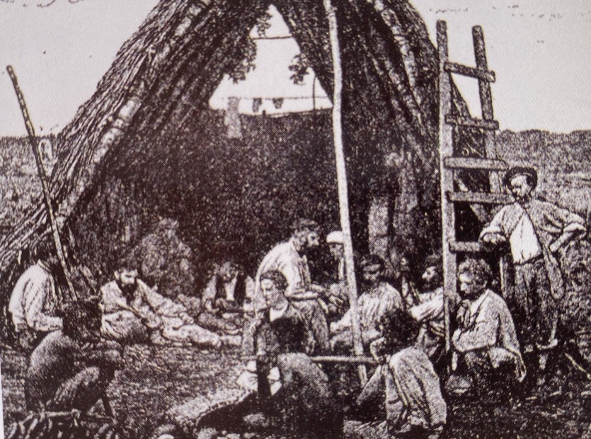 Un camp de déportés à l'ile des Pins. À leur arrivée, les conditions de vie des communards sont spartiates et les déportés participent à la construction de leurs baraquements." Entre 1872 et 1880, 3 000 communards, dont 13 femmes, séjourneront à l'ile des Pins. À leur arrivée, ils sont logés, comme les militaires, dans des paillotes élevées. Les bâtiments en dur, construits dans les années suivantes, sont surtout des casernes, des logements de fonctionnaires ou de surveillants, des ateliers, des prisons, et même une chapelle. Contrairement aux autres forçats, les déportés ne sont pas obligés de travailler à ces constructions mais, moyennant salaire, les ouvriers qualifiés y participent.