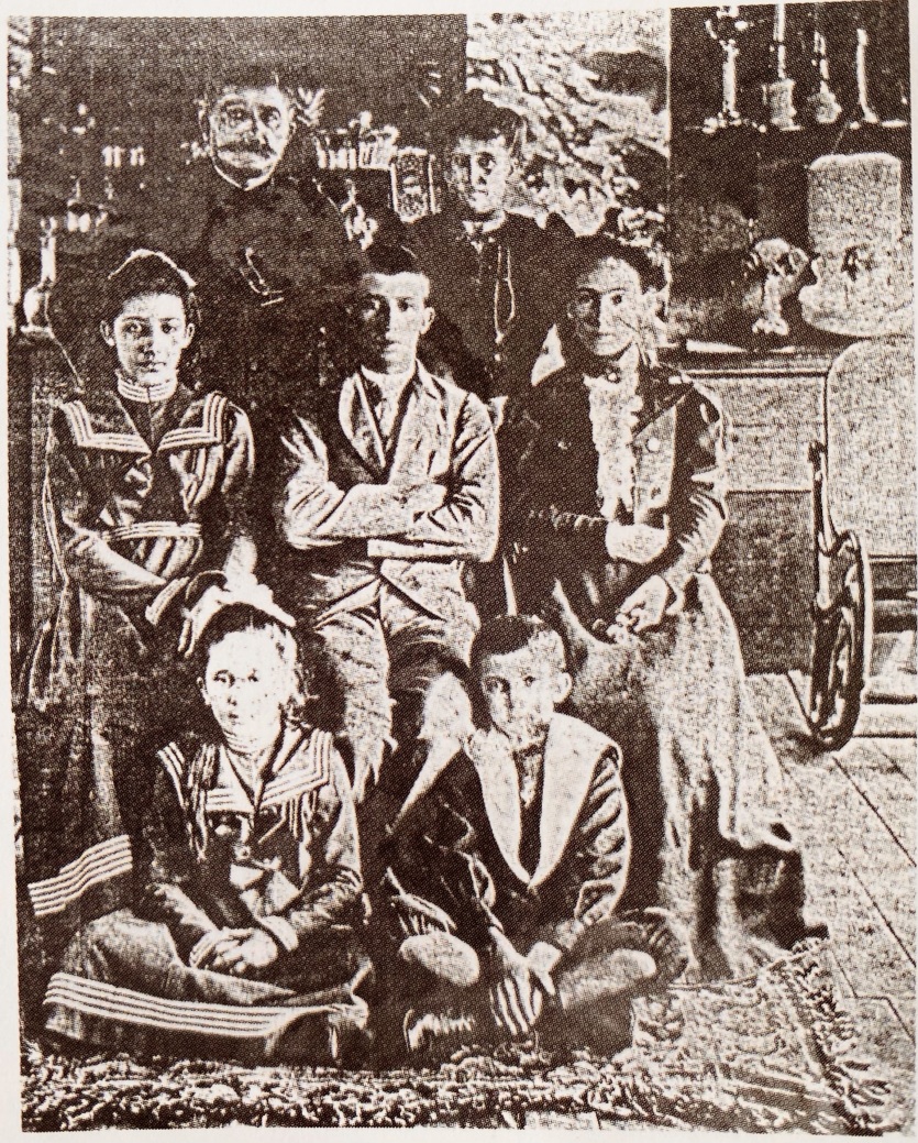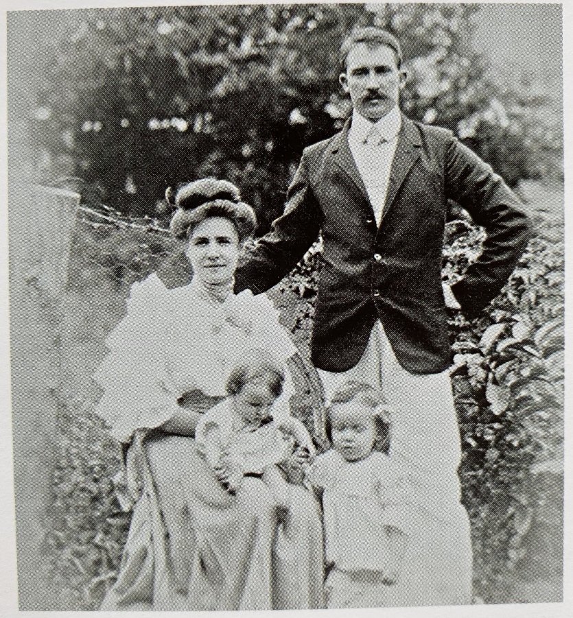 Eugène et son épouse Laurence Marie Duplessis. Ils se marient en 1906 à l'ile des Pins. Sur les genoux, Guy, qui décède prématurément de diphtérie, et leur fille aînée, Laurence Louise dite Lola.Ginette est la dernière. " Mon père a fait de nombreux métiers à de nombreux endroits: un peu de commerce, puis il a été officier d'état civil dans la baie du Sud.