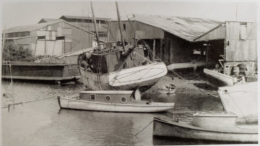Les ateliers de Raoul Pène. Une photo du carénage de sa goélette le Requin, baie de la Moselle. Le Requin, un ketch à moteur, est construit en 1930. Au premier plan, des petits cotres de pêche qu'il produisait également.Il tenait aussi un hôtel restaurant à Païta, un grand hôtel en bois; je me souviens des poteaux, devant, auxquels dans le temps on attachait les chevaux. Chaque mois, paraît-il, il organisait un bal. Il avait un deuxième établissement, un commerce, à l'emplacement de l'actuel magasin Saliman. "