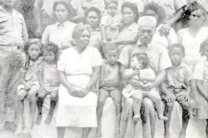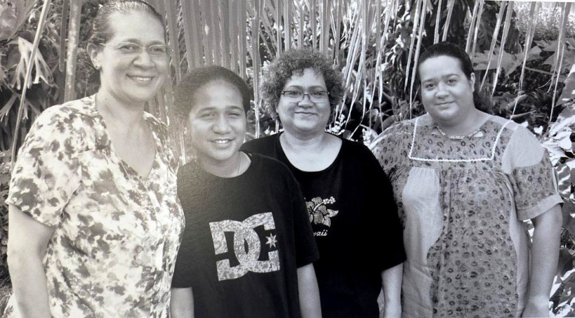 Dumbéa, 23 avril 2016. Les deux narratrices et leurs filles. De gauche à droite : Claudia Bienfait-Arii, sa fille Audrey Arii, Denise Bienfait-Def et Cindy Def. Photo DREt tout le monde écoutait religieusement, assis autour de la table. Il n’y avait pas le choix de toute façon ! Cette manière de vivre tous ensemble dans une grande maison a marqué la famille sur plusieurs générations. Et même si ma sœur et moi vivons aujourd’hui dans les environs de Nouméa, bien loin d’Arama et de la maison familiale, c’est notre éducation, notre identité. Pour toujours."