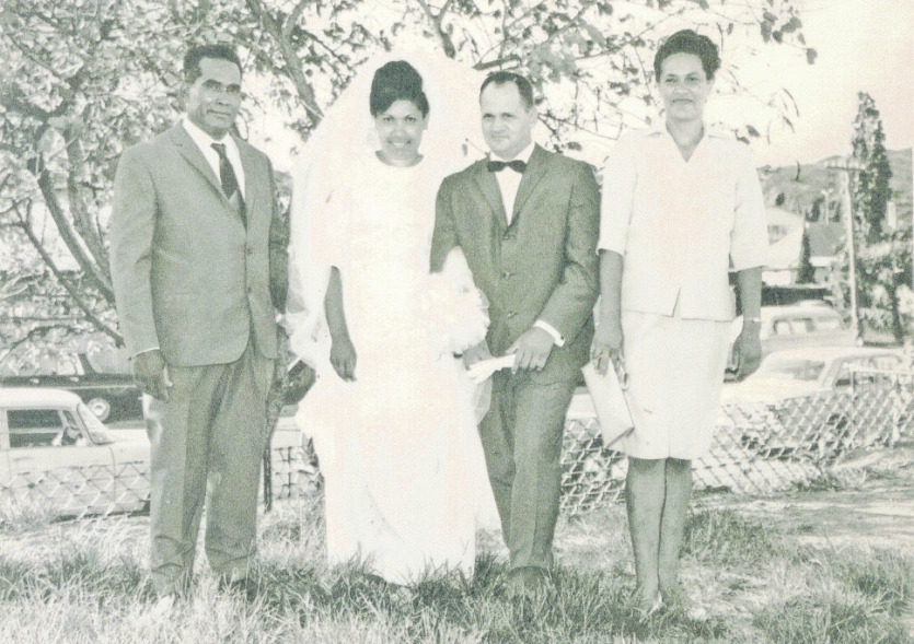 Nouméa, 6 janvier 1968. Armelle Bouteille et Yves Bienfait, entourés de Gaston Bouteille et Marcelle Newland, les parents de la mariée. Photo DRCapeta est donc une dame de haut rang. Elle a déjà eu cinq enfants avec un autre Européen, Antoine Pétazig. Elle en aura quatre autres avec Louis, et notamment mon arrière-grand-père, Louis-François, né en 1886.