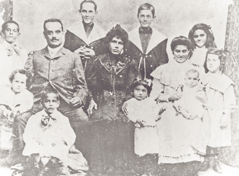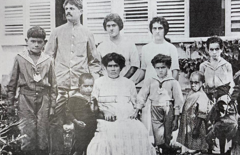 Marguerite Bouteiller et ses enfants vers 1914-1915. Debout de gauche à droite : Alexandre, Raoul Désiré Kabar, Marguerite, Marie-Louise et Maurice. Au premier rang, Loulou et sa grand-mère Marguerite Vray-Bouteiller, André et une petite voisine néo-hébridaise. Photo DRNote