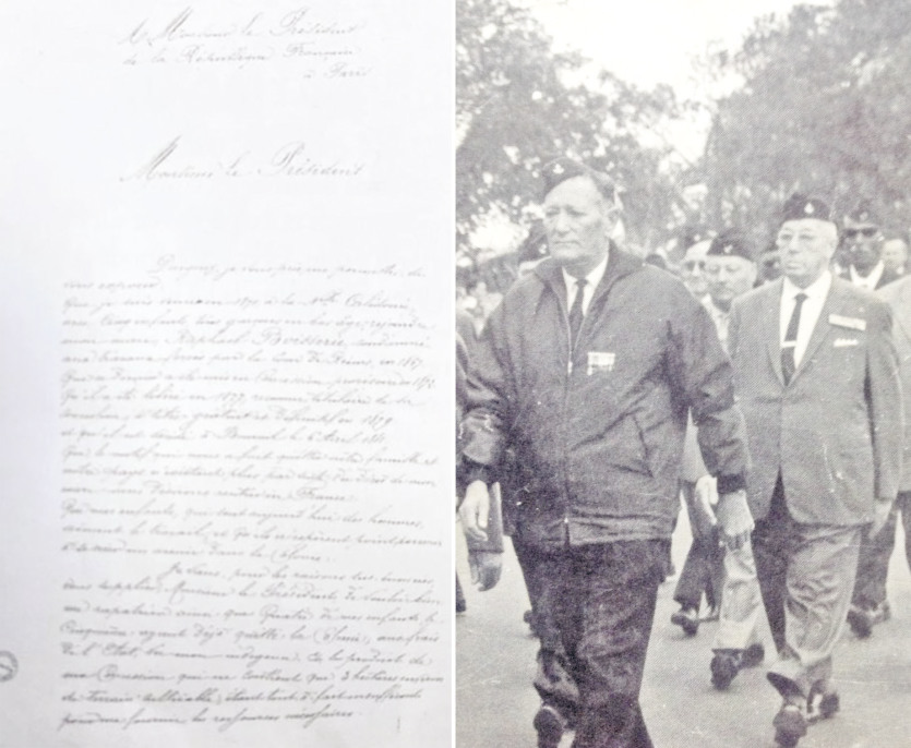 À gauche, la lettre de Raphaël demandant l’autorisation pour son épouse et sa famille de le rejoindre. À droite, défilé du 14-Juillet des Anciens combattants, en 1969. À droite de l’image, Paul Boissery. Photo DRMon grand-père Paul a été mobilisé en avril 1915 dans l’infanterie coloniale et expédié aux Dardanelles. Il a été évacué de Salonique en novembre 1916 car il avait attrapé le palu. Son retour a été mouvementé. Il a été embarqué sur le Gange pour revenir en Nouvelle-Calédonie, mais son bateau a été torpillé à Bizerte. Il est un double rescapé ! Un de ses frères, Ernest dit " Clovis ", a lui aussi été mobilisé. Il était facteur à bicyclette sur le front et, selon mon père, il racontait souvent qu’il se faisait bombarder sans cesse.