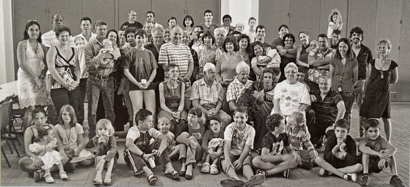 Cousinade en 2009. Au centre de la photo, assis (de gauche à droite) : Madeleine et son époux, Florindo fils; René, le père d'Irène (avec le chien) ; la dame en blanc est Andrée Paladini (veuve d'Isidore), la mère de Danièle Edo. Florindo fils et René sont décédés en 2015.Irène sort de grands registres aux pages jaunies et à l'écriture soignée qu'elle garde religieusement. Page après page, ils retracent jour par jour toutes les tâches effectuées par ses aïeux : " Le 20 avril, "acheté cheval blanc, soixante francs". ". Tiens, là, elle a écrit qu'ils ont "chassé les sauterelles dans les champs". " Ainsi, leurs affaires ont prospéré et la famille s'est agrandie. Onze enfants naissent mais seuls six arrivent à l'âge adulte.