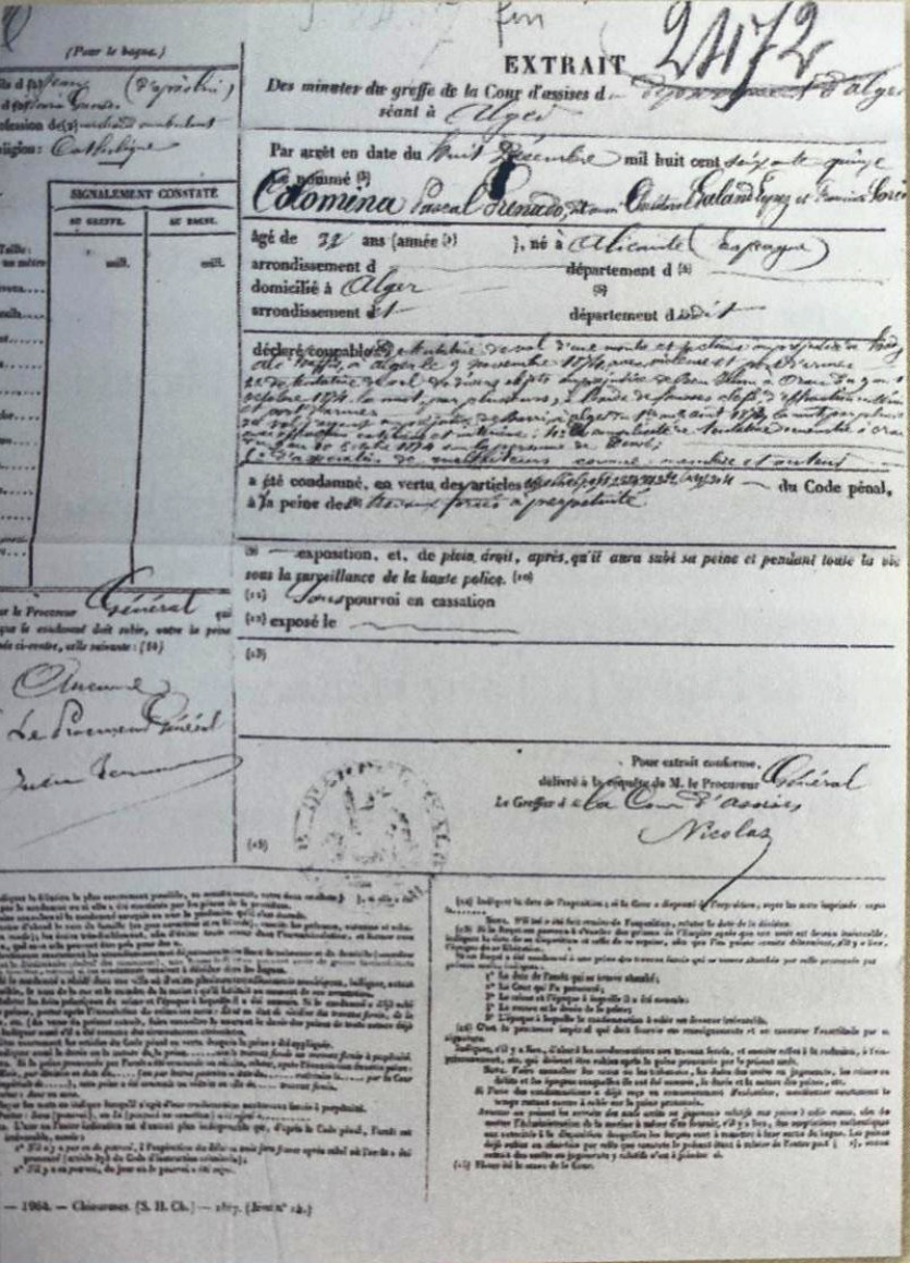 Le 8 décembre 1875, le sort de Pascal Colomina est scellé : la cour d’assises d’Alger lui inflige une peine de travaux forcés à perpétuité. Photo DRPascal Colomina Grenado, dit Christobal Galaud Lopez y Francisco, c’est son nom complet. Je fais partie de la sixième génération de ses descendants. Il est né en 1845 à Alicante, sur la côte méditerranéenne espagnole, en dessous de Valence. Ses parents sont des cultivateurs très modestes. Pascal va probablement à l’école car des documents ultérieurs indiquent qu’il sait lire et écrire. Malgré cela, il reste bien loin du rang social de Marie Mateaux (Matto ou encore Mattos selon les différents écrits), la demoiselle dont il fait la connaissance, qui vient d’une famille de bourgeois français installés dans la ville de Malaga, au sud du pays, où ils font commerce de tissu.