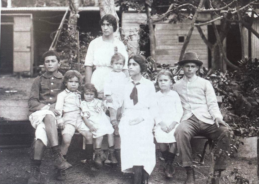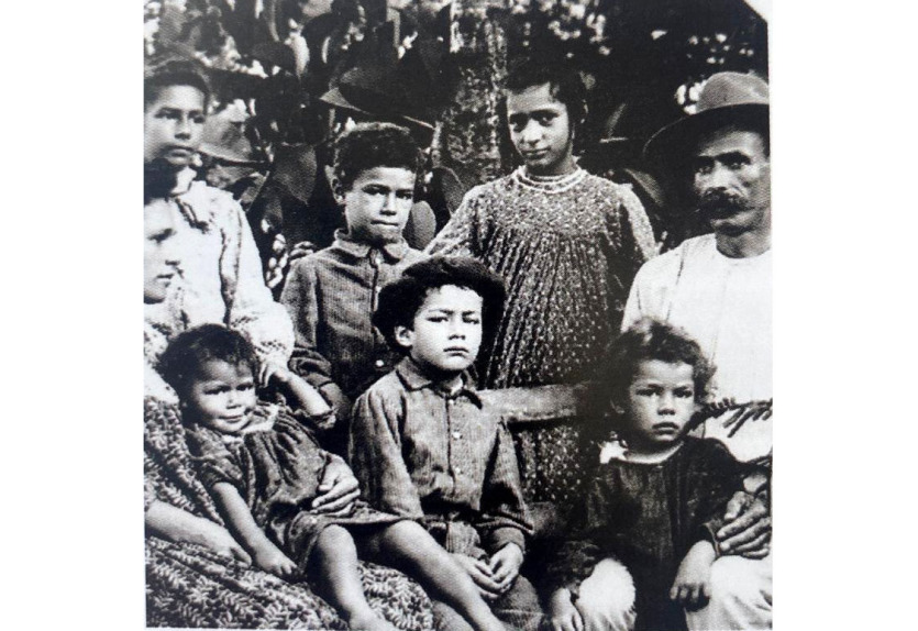 Jean et Amélie avec six de leurs douze enfants. La photo a été prise dans la maison familiale du Faubourg-Blanchot. Photo DRIl finit par redevenir paysan, jusqu’à sa mort en 1894, quelques mois avant le mariage de son fils aîné Joanny avec Amélie Amacque, une jeune métisse originaire des Nouvelles-Hébrides mais élevée à l’orphelinat des sœurs de Saint-Joseph de Cluny, à Koné. Ensemble, ils auront douze enfants. Joanny a alors presque 40 ans et il est déjà un petit mineur reconnu. "