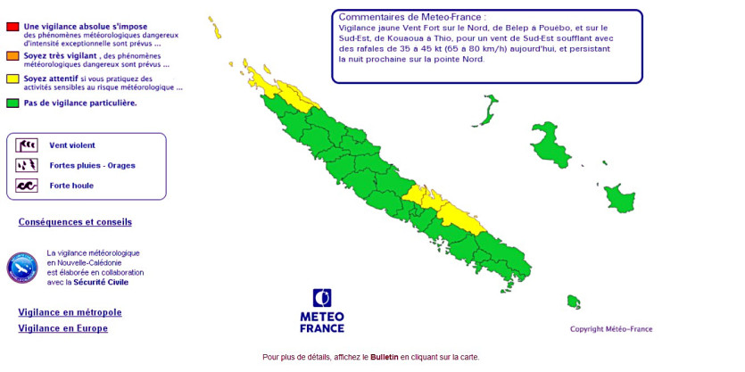Météo France NC émet une vigilance jaune, ce mardi, pour vents fort dans le Grand Nord, de Bélep à Pouébo, ainsi que sur le sud-est, de Kouaoua à Thio. Et ce, pour un vent de sud-est soufflant avec des rafales de 35 à 45 nœuds (soit 65 à 80 km/h), et persistant la nuit prochaine sur la pointe Nord.