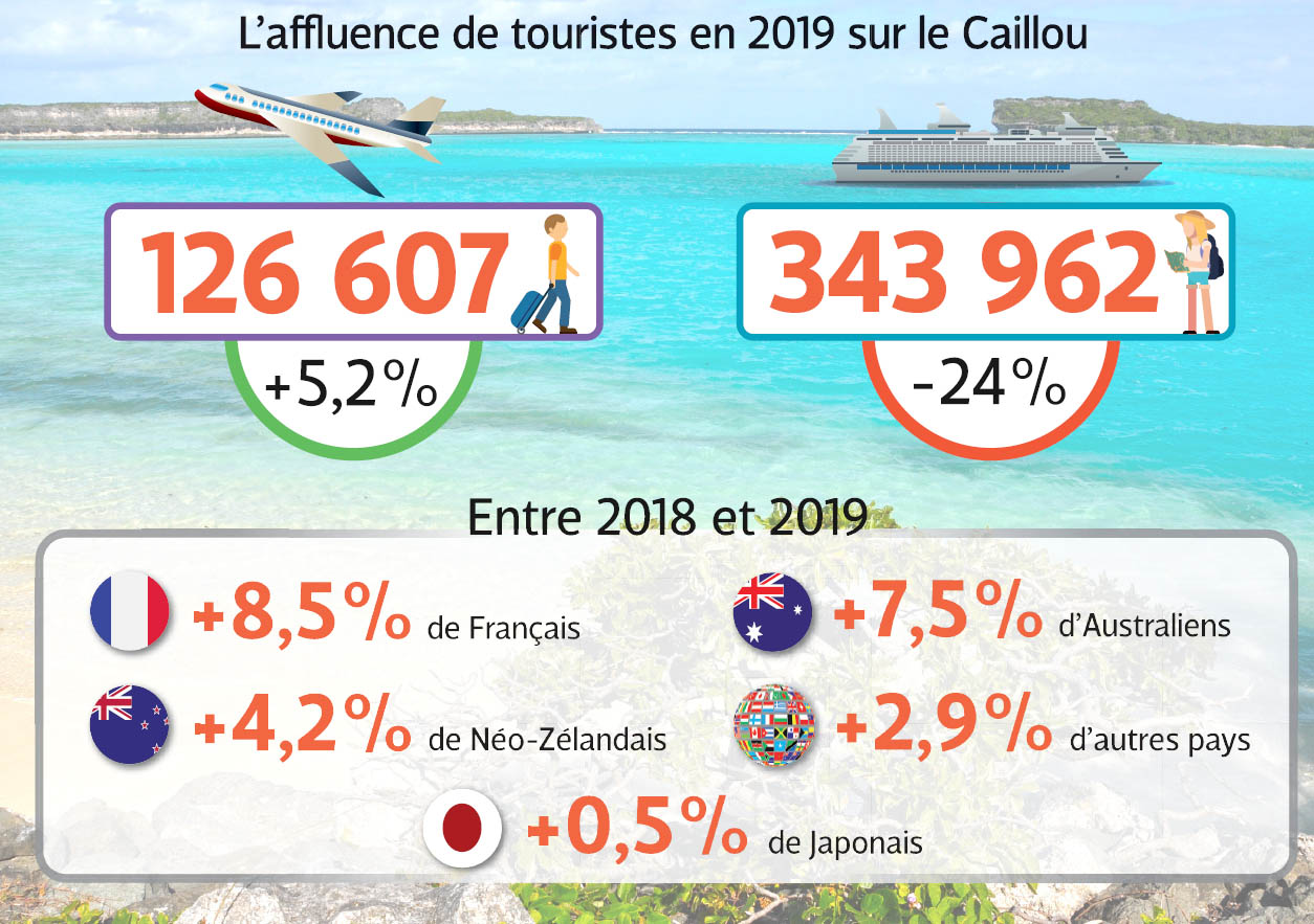 - Gros PlanPlus de 126 000 touristes ont visité le Caillou l’an passé, soit 6 000 personnes de plus qu’en 2018. De bons chiffres en partie dus aux Français et aux Australiens, plus nombreux. Au contraire, le marché de la croisière est dans le creux de la vague. Autre mauvaise nouvelle : en raison des coupes budgétaires, notamment, 2020 s’annonce « compliquée ».Un très bon cru « Ce sont des chiffres extrêmement dynamiques. Après une année 2018 qui n’avait pas été évidente, nous avons atteint un nouveau record en 2019 », annonce fièrement Jean-Marc Mocellin, le directeur de Nouvelle-Calédonie tourisme point Sud, qui dévoilait, hier après-Il vous reste 97% de l'article à découvrir.Cet article est réservé aux abonnés.