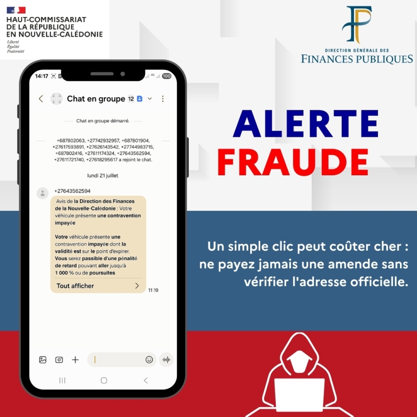 "Avis de la Direction des finances de la Nouvelle-Calédonie : votre véhicule présente une contravention impayée, dont la validité est sur le point d’expirer. Vous serez passible d’une pénalité de retard pouvant aller jusqu’à 1 000 % ou de poursuites…" Il ne faut surtout pas tenir compte de ce type de SMS et adopter la plus grande vigilance si vous en êtes destinataire. Il s’agit du contenu du message envoyé dans le cadre d’une campagne de SMS frauduleux visant au règlement d’amendes avec usurpation d’identité de la DFiP, la Direction des finances, informe le haut-commissariat, qui a lancé une alerte fraude mardi 22 juillet.
