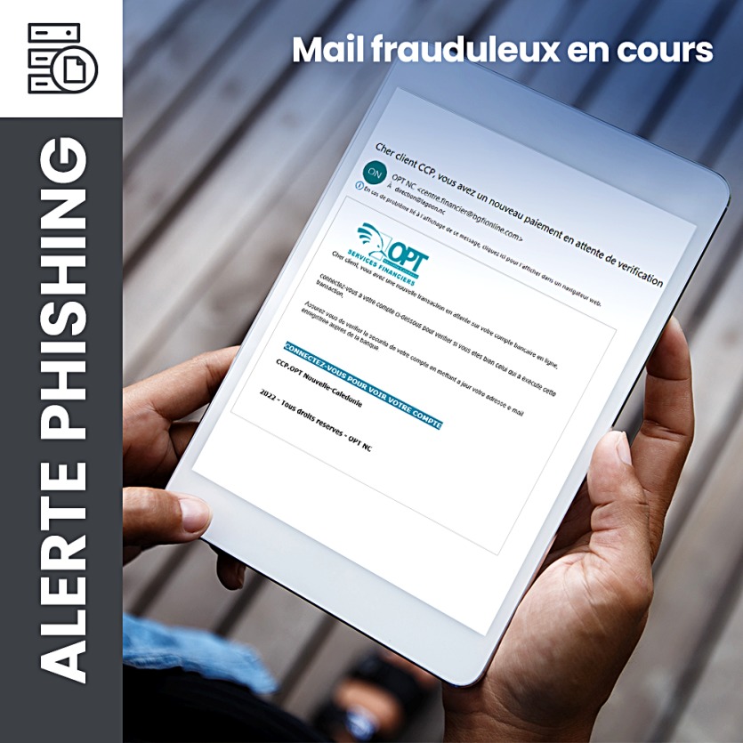 Les services de l'OPT alertent sur une tentative de "phishing" par e-mail. Il s'agit d'un message émanant d'un destinataire "OPT NC < customerservice@ccp.nc >". Ce courriel circule dans les messageries des Calédoniens "pour inciter les clients à se connecter sur un site internet en cliquant sur un lien", détaille l'office.
