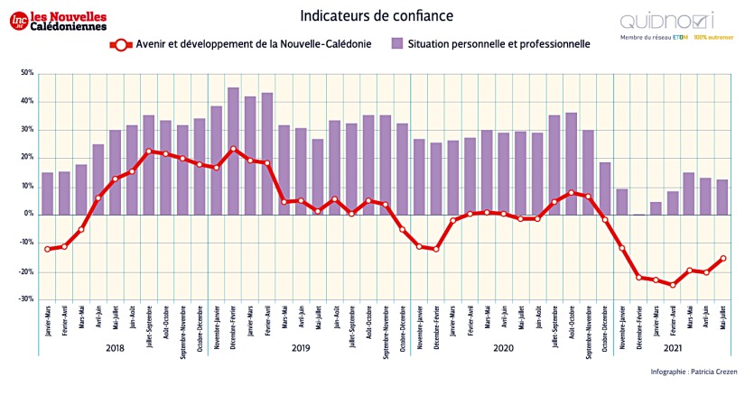 - L'institut de sondage Quidnovi publie un baromètre de la confiance des Calédoniens en l'avenir. Le pessimisme domine depuis fin 2020, en particulier chez les Européens et dans l'agglomération de Nouméa. Le contraste avec le reste du pays - la côte Ouest en particulier - est frappant.Une baisse de moral depuis fin 2020 L'institut Quidnovi a interrogé 1 500 personnes par an pendant trois ans, pour connaître leur degré de confiance en l'avenir. Pour Stéphane Renaud, le directeur, ce baromètre révèle depuis fin 2020 une domination particulièrement forte du pessimismeIl vous reste 97% de l'article à découvrir.Cet article est réservé aux abonnés.