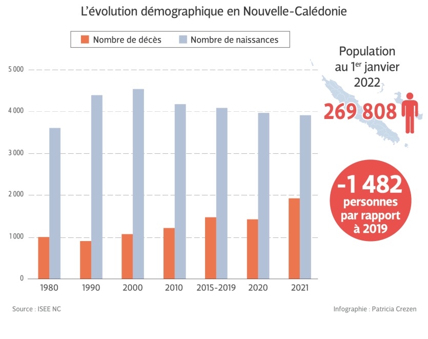 - L'Isee vient de publier son bilan démographique pour la période 2020-2021. Plongé en pleine crise sanitaire, le pays a enregistré un recul des naissances, une hausse des départs et une surmortalité très importante. De quoi provoquer une baisse inédite de la population.Une baisse « historique » de la population C'est une surprise. La population du Caillou aurait baissé au point de passer sous la barre des 270 000 habitants, au 1er janvier 2022. Cette diminution serait de -0,1 % (soit 330 personnes de moins) en 2020 et de -0,4 % (1050 personnes) en 2021,Il vous reste 97% de l'article à découvrir.Cet article est réservé aux abonnés.