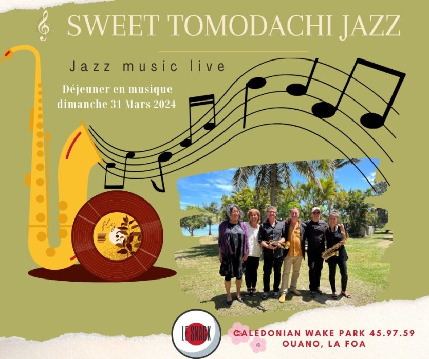 Le groupe de jazz Sweet Tomodachi est en concert à Ouano dimanche 31 mars. Photo DRSweet Tomodachi Jazz est en concert ce dimanche au Caledonian wake park de Ouano dès 11h30 pour un déjeuner musical. Renseignements sur la page Facebook de l’événement. Tél. : 45 97 59, info@packride.com.