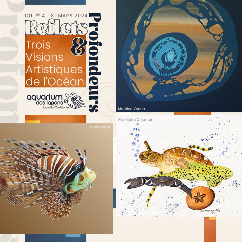 L’Aquarium des lagons propose l’exposition croisée Reflets et profondeurs, jusqu’au 31 mars. Les créations et inspirations de Mathieu Venon, Asa Maria Chipman et Yvan Flame sont à découvrir aux horaires d’ouverture de l’Aquarium. Renseignements : 61, promenade Roger-Laroque. Tél. : 26 27 31, ou : facebook@aquarium.nc.