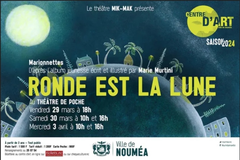 Spectacle Ronde est la lune de la compagnie Mik Mak. Photo Ville de NouméaLa compagnie Mik-Mak aborde les peurs nocturnes des enfants dans ce spectacle inspiré de l’album jeunesse de Marie Murtini. Un spectacle de marionnettes pour les enfants à partir de 2 ans. Ce mercredi à 10 heures puis à 16 heures. Tarifs : de 960 F à 1 500 F. Renseignements et réservations au Centre d’Art de midi à 16h30 ou sur tickets.nc.