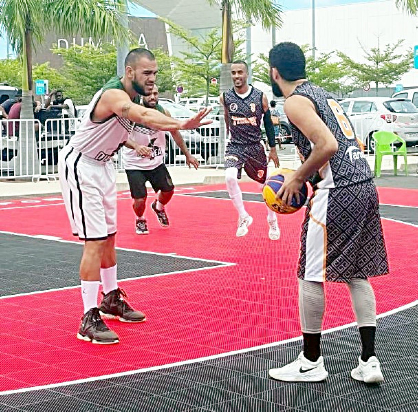 Les finales du championnat territorial de 3 contre 3 étaient, et c'est peu commun, organisées samedi sur le parking d'un hypermarché, celui de Dumbéa Mall. Le terrain, mobile et offert par la Fédération française, sorte de "puzzle géant", a été monté en un peu moins de trois heures, précise la Ligue calédonienne de basket-ball, heureux du bon déroulé de l'événement, initialement programmé sur la place des cocotiers. Cinq équipes étaient présentes chez les femmes, où la victoire est revenue à l'AS 6e Km (Adeline Souqué, Roselyne Forest, Zoréna Adjouhgniope, Coralie Forest), devant l'AS Rivière-Salée. La meilleure marqueuse du jour fut Loann Fisiipeau (33 points), de l'équipe 2 de l'AS 6e Km (qui a fini 3e). Chez les hommes, huit formations étaient engagées. Succès final de l'AS Dumbéa (Aboubacar Doumbia, Yann Mathelon ici en blanc, Paul Boawe, Jocelyn Lissarrague), devant une équipe de Rivière-Salée et devant l'AS 6e Km. Le meilleur marqueur du tournoi fut Landry Peu, avec 29 points.