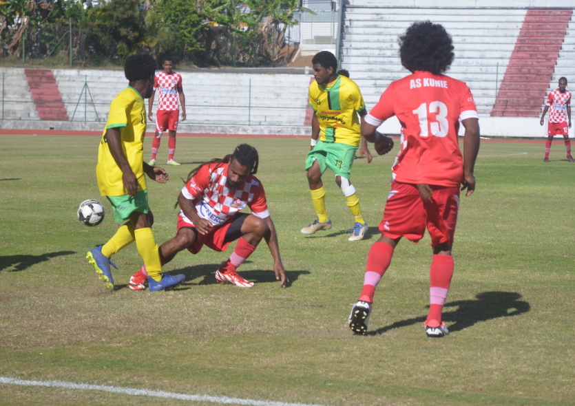 En battant le RC Poindimié 2 à 1 samedi après-midi à Numa-Daly, l’AS Kunié (en rouge) a assuré son maintien en Super Ligue. Photo Pierre GuillotDans le premier match de ce samedi après-midi, le RC Poindimié, champion de la PH Nord défiait l’AS Kunié, neuvième de la Super Ligue. Le début du match était équilibré jusqu’au moment de l’ouverture du score pour Poindimié grâce à Francis Poinrinpoe-Awi à la réception d’un centre de Francis Poadouy (18e). La réaction de l’ASK était puissante mais improductive. Jusqu’à l’égalisation de Vincent Vakié qui, en bon capitaine, montrait l’exemple à ses partenaires en décochant une frappe rasante et puissante des trente mètres qui faisait mouche, le gardien du Racing n’ayant pas esquissé le moindre geste tant le tir était soudain et inattendu (1-1, 36e).