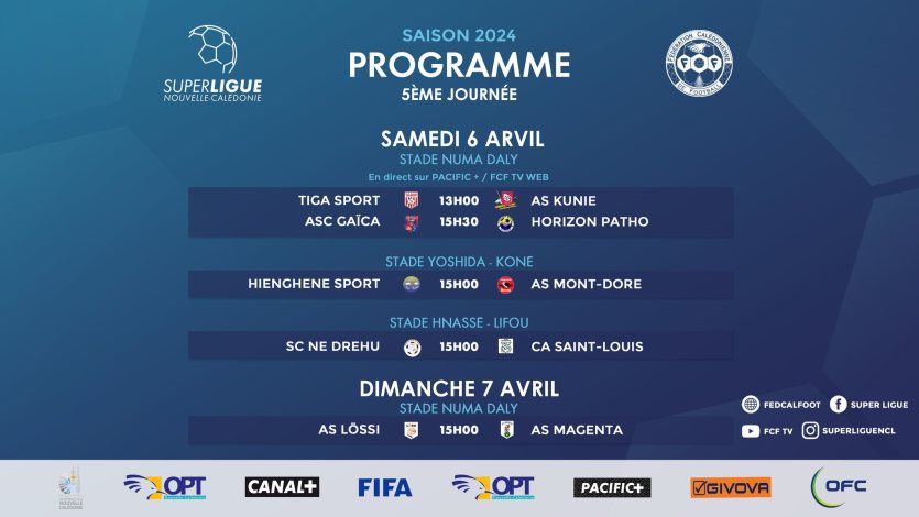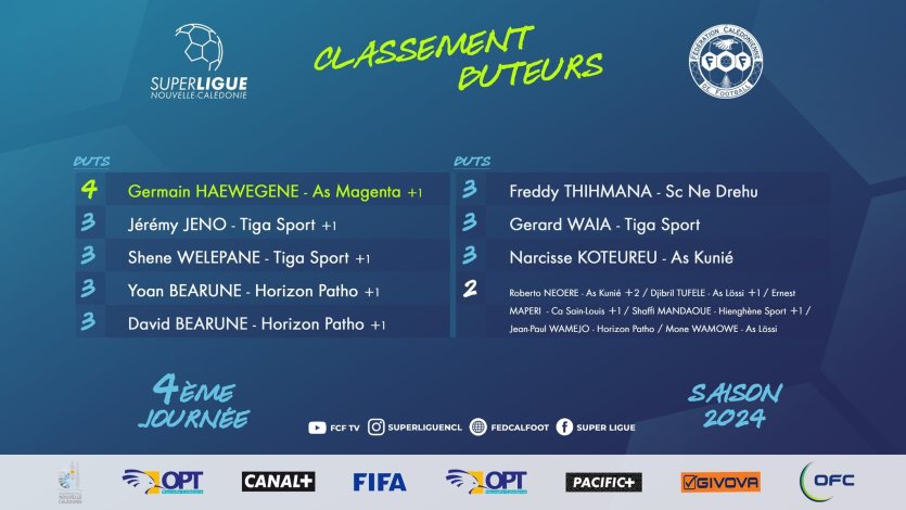 - Pierre Guillot | Crée le 05.04.2024 à 17h30 | Mis à jour le 12.04.2024 à 16h03ImprimerMeilleur buteur du championnat avec quatre réalisations, Germain Haewegene (en jaune) se heurtera dimanche après-midi à Numa-Daly aux défenseurs de Lössi. Photo Alain VartaneProgrammée en ce premier week-end d’avril, la cinquième journée de la phase régulière de la Super Ligue verra se dérouler samedi après-midi deux belles affiches avec les matches Kunié – Tiga et Gaïca – Horizon.