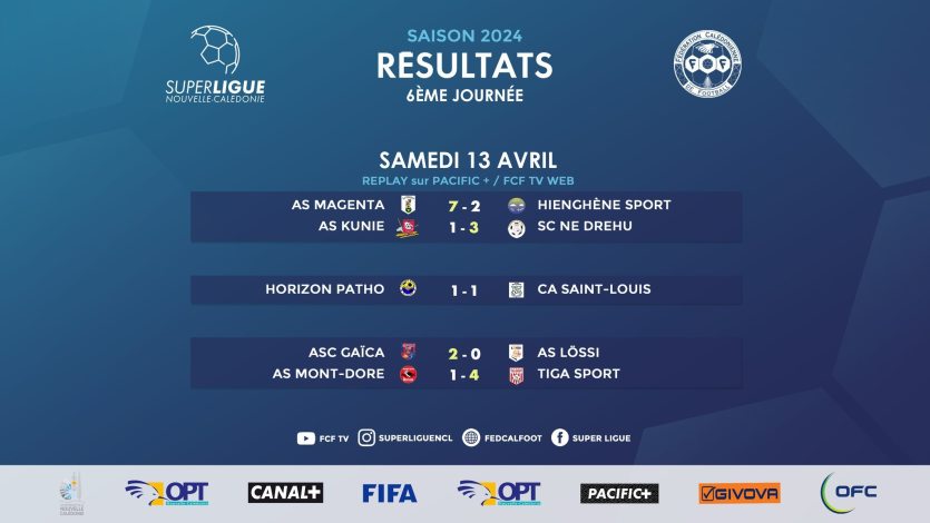 - Pierre Guillot | Crée le 14.04.2024 à 10h45 | Mis à jour le 14.04.2024 à 11h53ImprimerAuteur du premier but de son équipe, le capitaine Shene Wélépane a conduit Tiga Sport vers une victoire 4 à 1 devant l’AS Mont-Dore samedi après-midi au stade Victorin-Boéwa de Boulari. Photo Pierre GuillotLa phase régulière de la Super Ligue en était à sa sixième journée sur 18, samedi. Un premier tiers de championnat dominé par Tiga, qui a ajouté une nouvelle victoire à son compteur en venant à bout de l'AS Mont-Dore (4-1), à Boulari. A noter également le joli succès de Magenta sur Hienghène, 7 buts à 2.