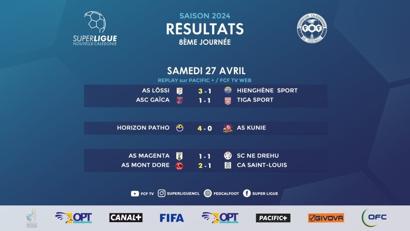 - Au Mont-Dore, stade Victorin-Boéwa, AS Magenta et SC Ne Drehu font match nul 1 à 1 (0-0). Buts Germain Haewegene (70e) pour Magenta ; Dylan Sio (61e) pour Ne Drehu.