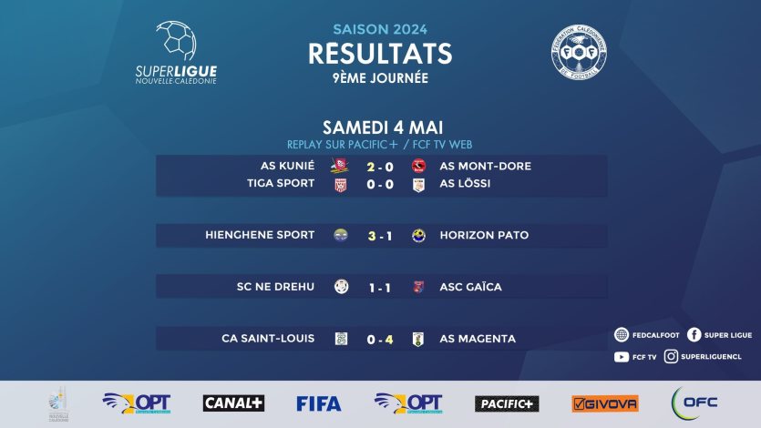 - A Koné, stade Lucien-Yoshida, Hienghène Sport bat Horizon Sport 3 à 1 (1-0). Buts : Jordan Wétria (27e), Brice Dahité (56e, 78e) pour Hienghène ; David Béaruné (51e) pour Horizon.