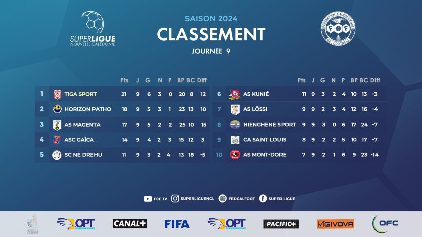 Au retour des vestiaires, David Béaruné a marqué son quatrième but pour permettre à Horizon d’égaliser (1-1, 51e). Puis on a vu Brice Dahité signer un doublé (56e et 78e) sur deux magnifiques coups francs dont un en pleine lucarne pour permettre à son équipe de l’emporter 3 à 1. Et c’est ainsi que Hienghène a mis fin à une série de trois défaites de rang. Sa troisième victoire lui permet même de bondir de la dixième et dernière place à la huitième. Malgré ce premier revers Horizon conserve son deuxième rang mais se retrouve désormais à trois longueurs de Tiga, Ce dernier ayant été tenu échec par l’AS Lössi au terme d’une rencontre sans but.
