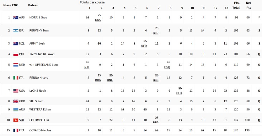 Les résultats des 10 qualifiés lors des manches de sélection pour la course finale : la "Medal race". En pied, ceux de Nicolas Goyard, non qualifié pour la suite du tournoi olympique. Photomontage LNCMERCI DE VOUS IDENTIFIER