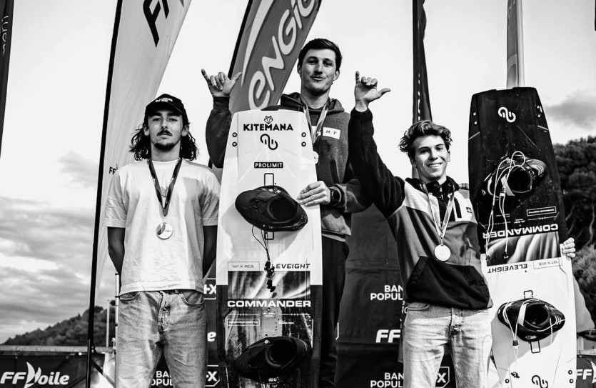 Les deux Calédoniens Arthur Guillebert (au centre) et Antoine Ollivier (à droite) ont déroché la première et troisième place de la catégorie kitesurf freestyle, lors des championnats de France. Photo DRMERCI DE VOUS IDENTIFIER