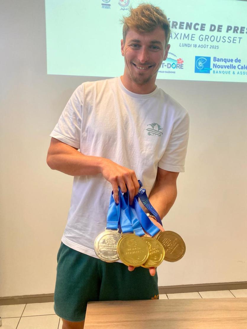Le seul cagou volant du monde est de retour sur son île natale pour quelques semaines de vacances bien méritées. Le nageur Maxime Grousset a été célébré comme il se doit lundi soir par le Comité territorial olympique et sportif (CTOS) qui lui a remis la médaille de la jeunesse, des sports et de l’engagement associatif ainsi que les trophées de l’athlète des mois de juin et de juillet. Des récompenses bien méritées pour le détenteur de quatre titres mondiaux, dont les deux derniers décrochés les 28 juillet et 2 août 2025 à Singapour, sur 50 m et 100 m papillon. Après son titre sur 100 m papillon à Fukuoka en 2023 et celui en 4 × 50 m nage libre mixte à Melbourne en 2022, Maxime Grousset fait à présent partie du cercle très fermé des multiples champions du monde calédoniens, aux côtés de Michel Quintin, Laurent Gané, Titouan Puyo ou encore Pierre Fairbank.