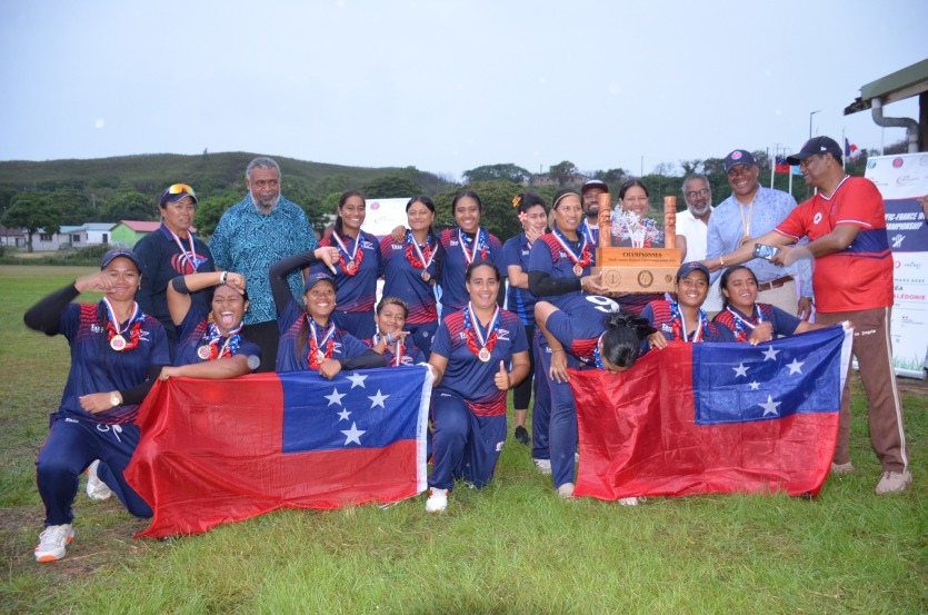 Sur la première marche du podium, l’équipe de Samoa. Photo Gouvernement NCLe tournoi des quatre nations de cricket féminin du Pacifique s’est déroulé la semaine dernière au stade de N’Du, à Numbo, à Nouméa. La compétition, placée sous l’égide de France Cricket, en partenariat avec le comité national de cricket de Nouvelle-Calédonie, a réuni les équipes du Vanuatu, de Samoa, de Fidji et de France, composée pour l’occasion à 100 % de joueuses calédoniennes. Samoa a terminé en tête du classement, suivi du Vanuatu, de Fidji et de la France. Une étape significative pour ces sportives, qui participaient "pour la première fois à des rencontres internationales", selon le gouvernement. Son président, Alcide Ponga, et le membre chargé du sport, Mickaël Forrest, ont participé à la cérémonie de clôture vendredi 14 mars.