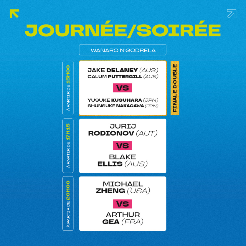 Malgré une bonne entame de match, le Français Clément Tabur s’est incliné en trois sets face à Michaël Zheng, jeudi 8 janvier. Photo Baptiste GouretL’autre affiche de ce vendredi, c’est aussi la finale en double, prévue à partir de 15 heures. La paire australienne Jake Delaney-Calum Puttergill, qualifiée d’office à la suite du forfait de Jordan Thompson et Pierre-Hugues Herbert, affrontera les Japonais Yusuke Kusuhara et Shunsuke Nakagawa.