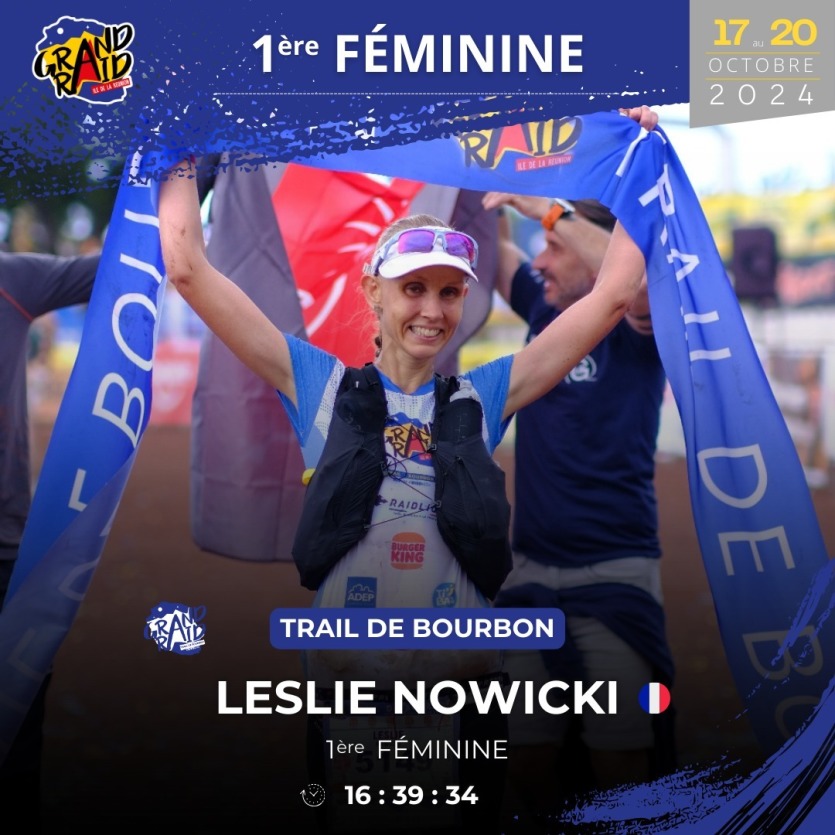 Le Trail de Bourbon, deuxième course individuelle la plus longue après la Diagonale des fous avec ses 100 km et ses 6 090 mètres de dénivelé positif dont le départ est donné de Cilaos, traverse les trois cirques avant de rejoindre le stade de la Redoute à Saint-Denis en passant par La Possession et le Colorado. Ce dernier passage a compliqué la course de la Calédonienne qui, malgré une météo "parfaite" sur la majorité du parcours, a dû emprunter un sentier particulièrement glissant en raison de la pluie qui est tombée sur le secteur. Leslie Nowicki a malgré tout dominé la concurrence et enregistre à l’arrivée plus de 40 minutes d’avance sur sa plus proche concurrente, la Réunionnaise Marion Zaradzki, 2e féminine (17 heures 19 min et 21 sec) donc et 21e du classement général. Chloé Mériel termine troisième en 17 heures 45 min et 14 sec.