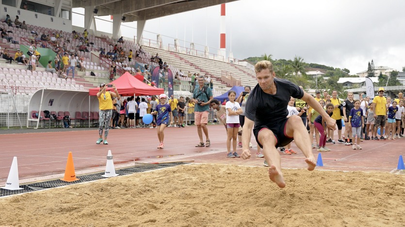 - | Crée le 08.12.2022 à 10h15 | Mis à jour le 08.12.2022 à 10h32ImprimerKevin Mayer, double champion du monde du décathlon, offre une démonstration de saut en longueur aux jeunes athlètes. Photo Marion ThellierLa première édition du meeting organisé par le Track’NC s’est tenue mercredi après-midi au stade Numa-Daly. Kevin Mayer, recordman du monde du décathlon, a été un parrain très sollicité qui a accentué la notion de plaisir et de partage prônée par le club de Nouméa.