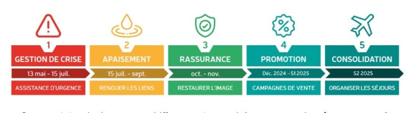 Les cinq étapes du plan 2024/2025 de relance du tourisme. Source NCTDe son côté, Daniel Houmbouy, directeur général de la compagnie Aircal, également confrontée à la chute des touristes, a indiqué, lors d’un entretien accordé aux Nouvelles, miser sur un retour à la normale du trafic à l’horizon 2028-2029. Un scénario que Julie Laronde juge, de son côté, trop lointain et pessimiste.