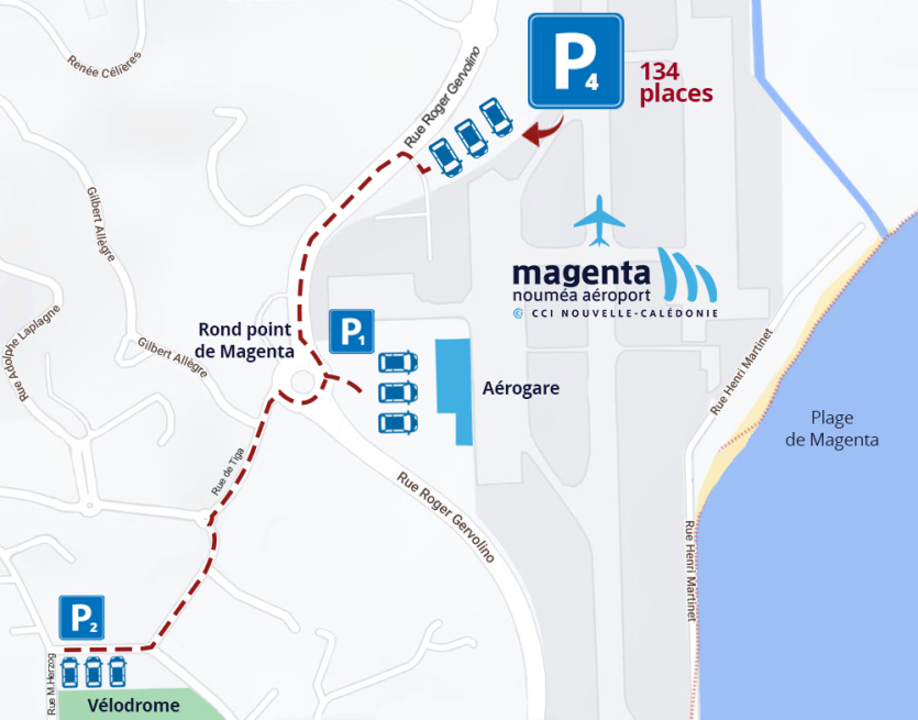 Pour rappel, depuis lundi l’accès à l’aéroport de Nouméa-Magenta peut désormais se faire directement via le rond-point de l’aérodrome pour toutes les personnes listées en tant que passager et le service de navettes au départ de la gare routière Raï est suspendu. Les passagers doivent se présenter par leurs propres moyens à l’aéroport. Un filtrage a toujours lieu au niveau du rond-point et seules les personnes détentrices d’un titre de transport pourront accéder au site (un seul bagage autorisé). Les propriétaires des véhicules sont invités à se garer sur les parkings P2 et P4 (plan d’accès ci-dessous).
