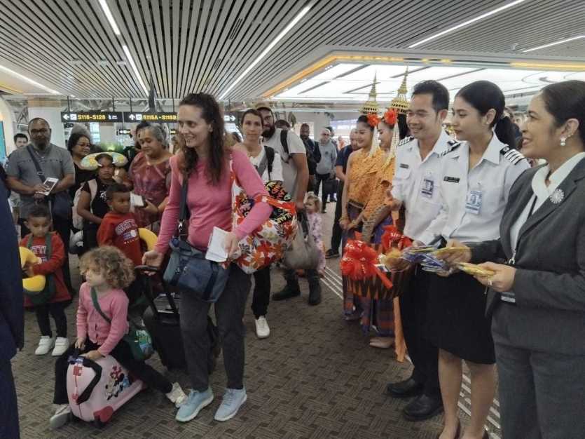 Les passagers à destination de Paris embarquent pour ce premier vol d'Aircalin reliant Bankok à la ville lumière. Un cadeau leur a été offert avant de monter dans l'avion. Photo Anthony Tejero"Bangkok est une destination prisée des Calédoniens. Cette ligne, économique mais aussi humaine, va contribuer à accroitre l’attractivité de la Nouvelle-Calédonie, mais ce que nous célébrons aujourd’hui c’est aussi une nouvelle vision qui permet de mieux relier les territoires français du Pacifique à la France grâce à Bangkok."