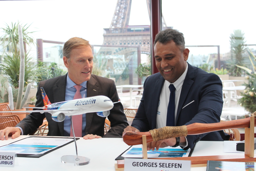 Le constructeur Airbus et Aircalin réunis sur une terrasse avec vue imprenable sur la tour Eiffel, depuis les toits du Quai-Branly. Le décor de la conférence de presse organisée jeudi 12 décembre à Paris, donne le ton et montre bien les nouvelles ambitions de développement de la compagnie à l’hibiscus : miser sur le très long courrier. Envisagée depuis de longs mois, l’annonce de l’achat de deux A350-900 auprès de l’avionneur français est désormais officielle, avec une signature de contrats qui intervient au lendemain de l’atterrissage à Charles-de-Gaulle, du vol inaugural Paris Nouméa via Bangkok entièrement opéré par Aircalin.